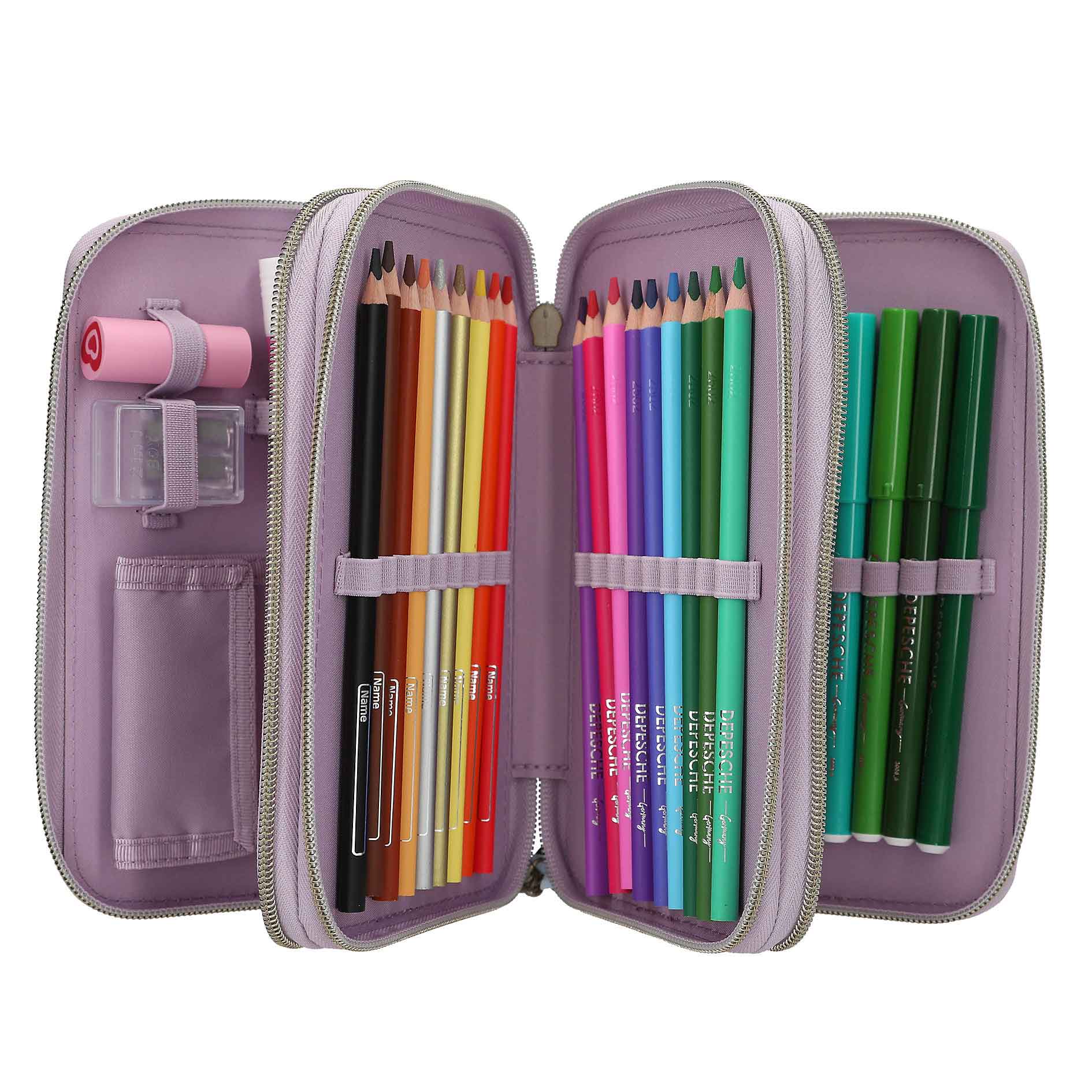 - estuche de 3 pisos de TOPModel en crema y lila, completamente lleno de material