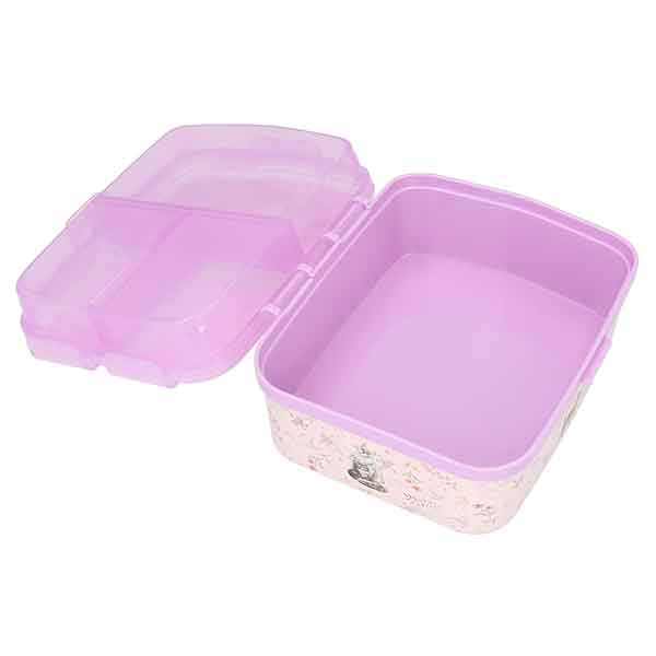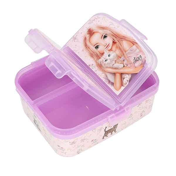 Kitty-cool! La fiambrera de TOPModel decorada con un fantástico motivo de una modelo con un gato, además de monísimos gatitos y flores delicadas en los laterales, tiene tres compartimentos separados con cierre de clip en la parte superior, además de un cuarto compartimento muy amplio en la parte inferior. Se recomienda lavado a mano para proteger las serigrafías. No apta para uso en microondas. Material: plástico «PP», no contiene bisfenol-A (BPA) ni plastificantes (ftalatos).