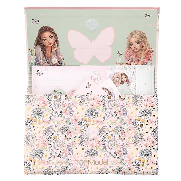 - ¡Con flores fantásticas! Este maravilloso papel de cartas de TOPModel hace que escribir a las personas queridas sea el doble de divertido: colores primaverales suaves, flores, filigranas y mariposas delicadas y modelos de TOPModel guapísimas. El set se compone de 24 hojas de papel de cartas (3 diseños) y 18 sobres a juego, todo ello presentado en una preciosa carpeta de fuelles hecha de cartón robusto.