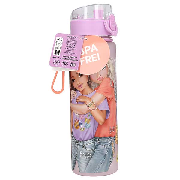 - Esta botella de 500 ml es típica TOPModel: colorida, alegre y con estilo. La superficie semitransparente está adornada con dos modelos a gran tamaño y muchos prints en imitación de pegatinas. Con módulo de boquilla rosa, tapa transparente que se abre con sistema flip top (puede usarse con una sola mano) y asa de silicona naranja. Se recomienda lavado a mano para proteger la decoración. No apta para lavavajillas ni microondas. Material: plástico tritán (neutro a los olores), libre de bisfenol A (BPA) y de plastificantes (ftalatos).