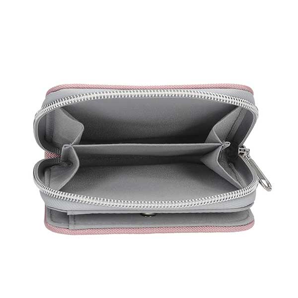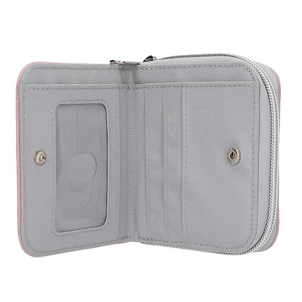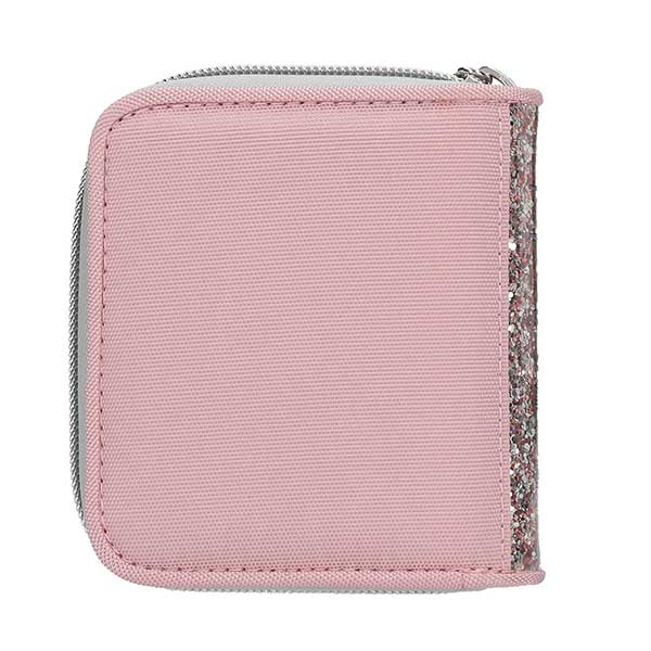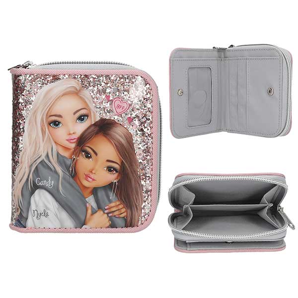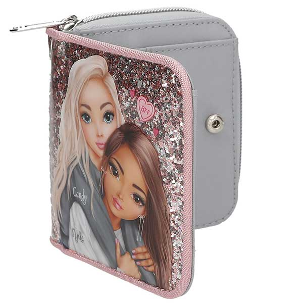• El monedero rosa y gris de TOPModel es brillante y genial. Las dos estilosas modelos que decoran la cara delantera destacan sobre fondo completamente cubierto de purpurina. Dispone de compartimento para monedas con cierre de cremallera, compartimento para billetes, varios tarjeteros y ventana transparente. Material principal: poliéster 100 por 100; adornos: PVC 100 por 100.