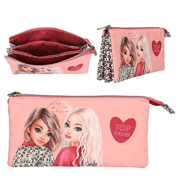¡Amor por el estampado animal! La cara delantera de este estuche de fuelle rosa de TOPModel está adornada con dos estilosas modelos y un corazoncito con logo estampado. La parte trasera y el bolsillo interior llevan el mismo estampado an tendencia que la chaqueta de la modelo. Los tres compartimentos van forrados en color rojo cereza y ofrecen mucho espacio para todo tipo de lápices, rotuladore demás. Material principal: poliéster 100 por 100.