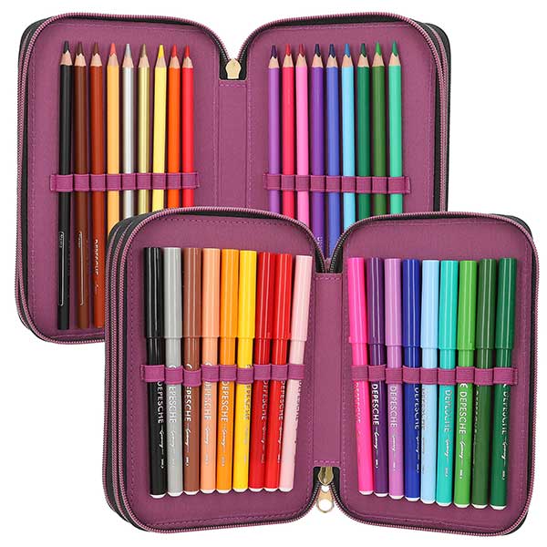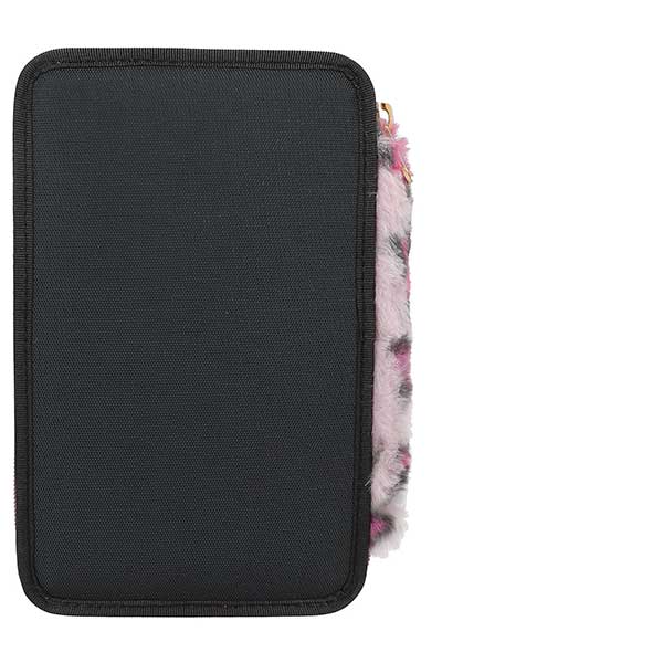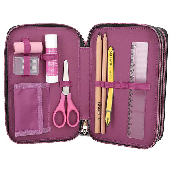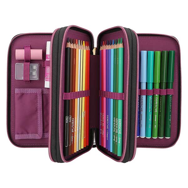Rebel Kitty. Este estuche de la nueva colección de diseño de TOPModel lleva en la cara delantera tres modelos muy cool sobre fondo completamente cubierto de purpurina. Otros elementos a destacar: las cremalleras lila, el lateral de piel sintética con estampado animal en lila y negro, además de un monísimo colgante de gatito. Los tres compartimentos separados vienen completamente llenos con 18 lápices de colores, 18 rotuladores, 2 lápices, sacapuntas, goma de borrar, regla, tijeras, pegamento en barra e incluso lleva un bolsillito con cierre de velcro. Material: PES 100 por 100; cara delantera PVC.