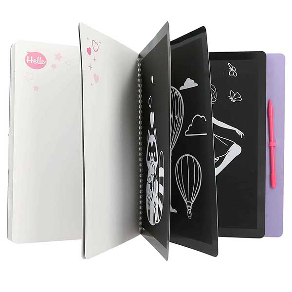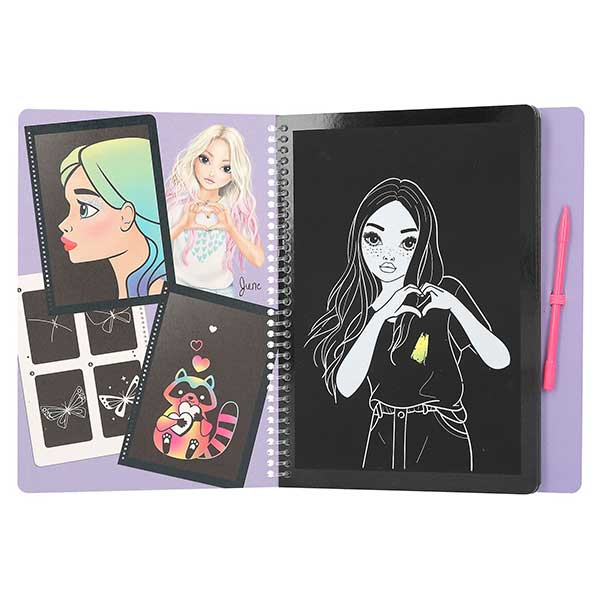 El cuaderno TOPModel Magic Scratch contiene todo lo necesario para crear auténticas obras de arte con solo rascar: 20 páginas con diseños monísi mos, instrucciones sencillas y el lápiz para rascar correspondiente.