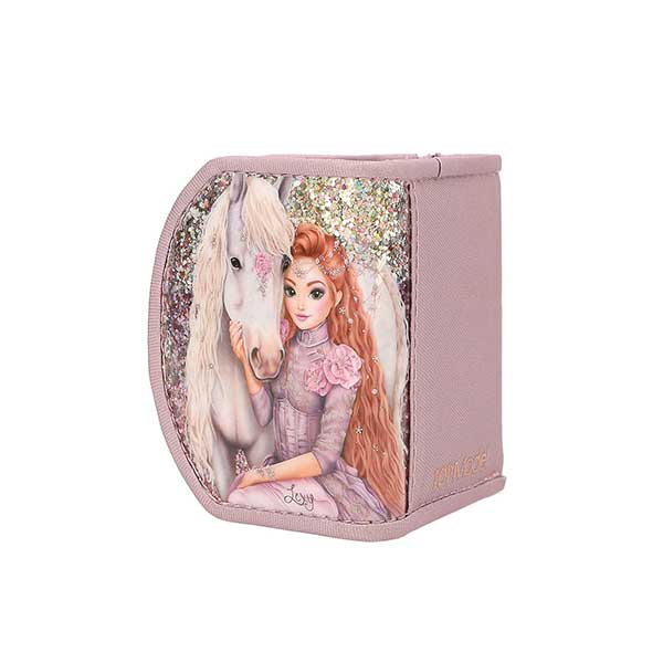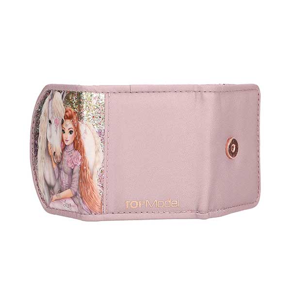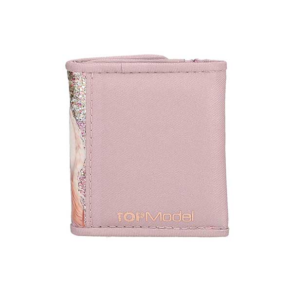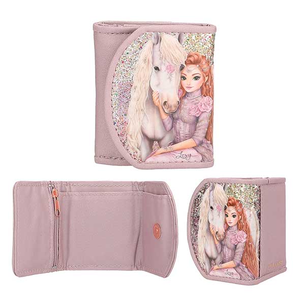 - Viva Violet: La cara delantera de este monederito de TOPModel color lila pálido está decorada con mucha purpurina y una modelo con un caballo maravilloso. En el interior dispone de un apartado para los billetes y un bolsillo con cremallera para las monedas. El monedero tiene cierre de botón magnético. Material principal: poliéster 100 por 100; parte delantera 100 por 100 PVC.