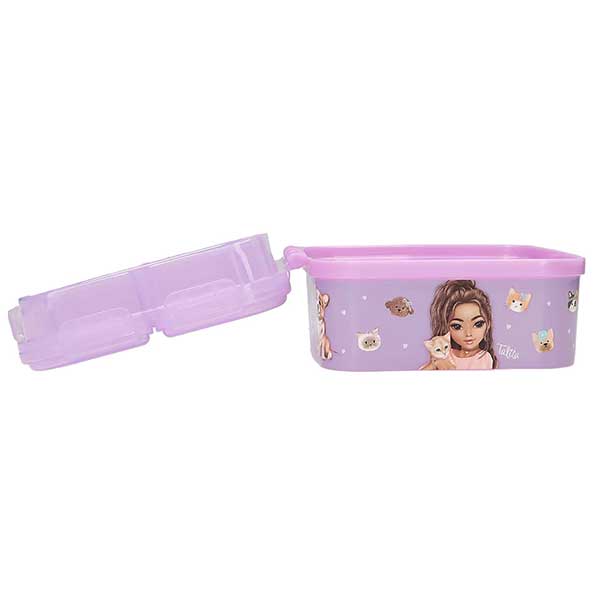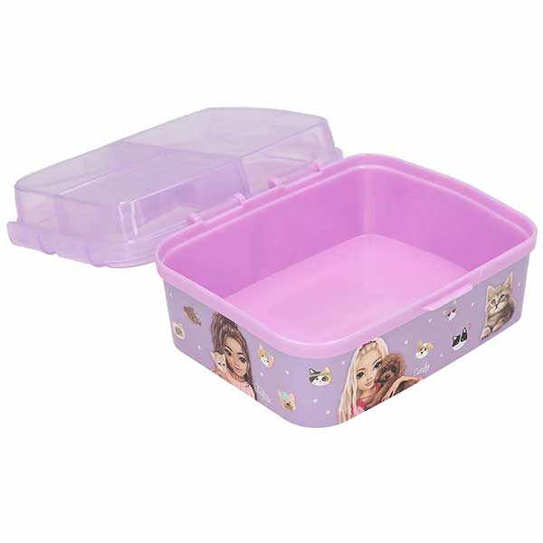 • Esta fiambrera lila de TOPModel, adornada con maravillosos motivos de modelos, gatitos y perritos, está subdividida en tres compartimentos separados, tiene tapa con cierre de clip y mucha capacidad. Se recomienda lavado a mano para proteger la decoración. No apta para uso en microondas. Material: plástico PP, libre de bisfenol A (BPA) y plastificantes (ftalatos).